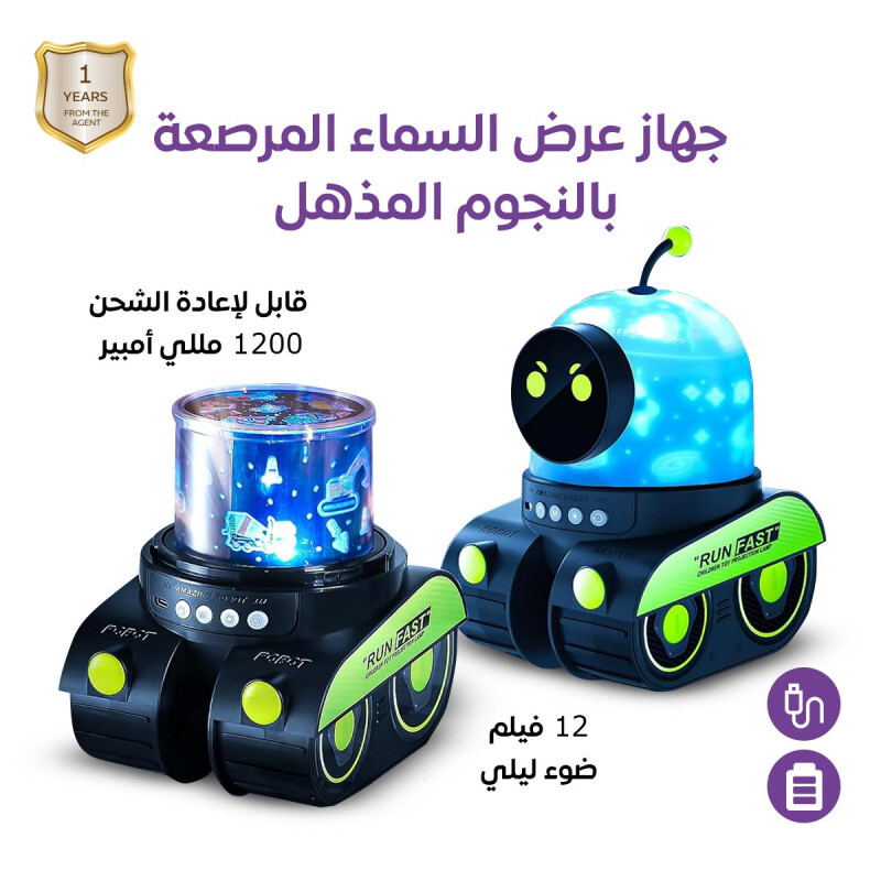 جهاز عرض روبوت فريد من نوعه: روبوت لطيف ومثير للاهتمام هو جهاز عرض سماء مرصعة بالنجوم للأطفال. الجزء العلوي عبارة عن جهاز عرض سماء مرصعة بالنجوم لطيف للأطفال، والأرضية مصممة على شكل شاحنة، حتى يتمكن الأطفال من تحريك هذا الروبوت بمرونة. جهاز عرض سماء مرصعة بالنجوم للأطفال وجهاز عرض سماء مرصعة بالنجوم وجهاز عرض ضوء الليل للأطفال هي هدية مثالية للأولاد.
