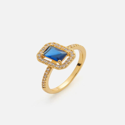 - التفاصيل: خاتم بتصميم فاخر يتزين بحلية بشكل هندسي مرصعه بفصوص الزركون وبحجر زركون بارز بلون أزرق