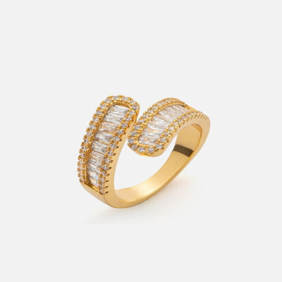 خاتم نسائي بتصميم كلاسيك باللون الذهبي، خاتم بتصميم متداخل يتزين بفصوص من الزركون اللامع ، اضيفي لمسه أنثويه راقيه الى طلتك مع هذا الخاتم ، خاتم يناسب إطلالتك المسائية .