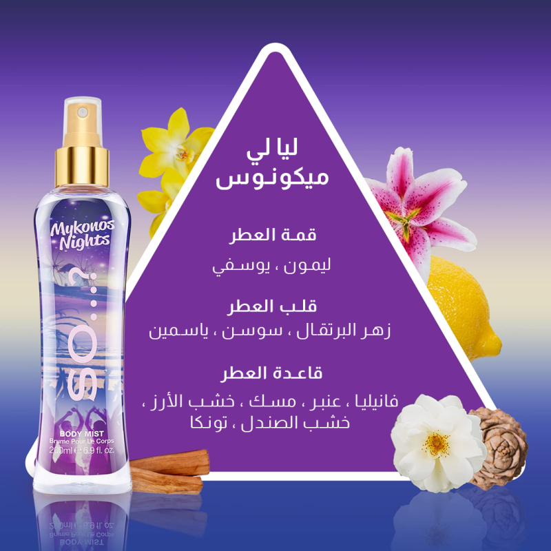 عطر جسم “ليالي ميكونوس” 200 مل. استمتعي بأجواء غروب الشمس مع رائحة الفانيليا الحلوة وحبوب التونيك الممزوجة برائحة الليمون المنعش واليوسفي الحلو.