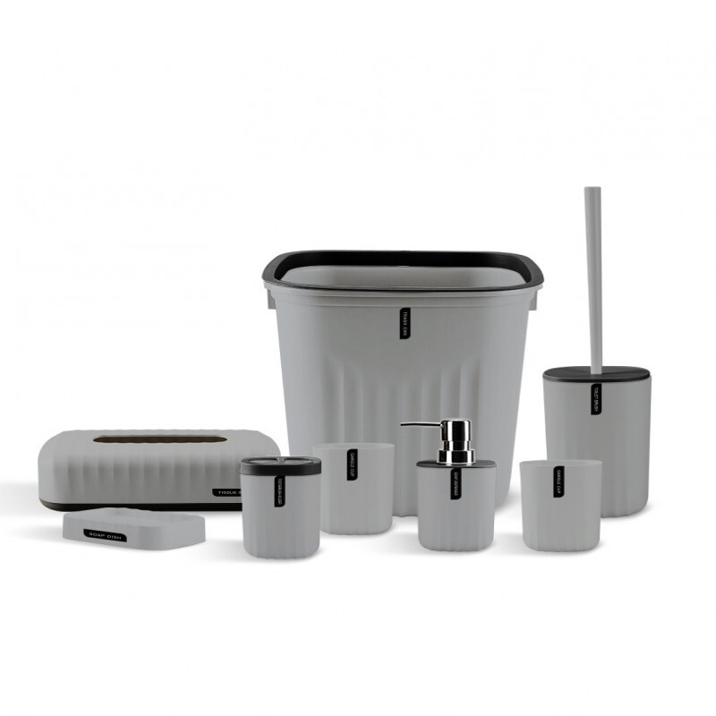 سلة مهملات ، طبق صابون ، موزع غسول ، 2 كوب ، حامل فرشاة الأسنان ، حامل فرشاة المرحاض ، حامل مناديل