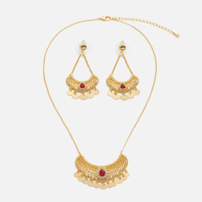 - يتميز الطقم بتصميم حلية بشكل مميز مرصعة بفصوص الزركون البراقة بلون أحمر تضفي لمسة من الجاذبية