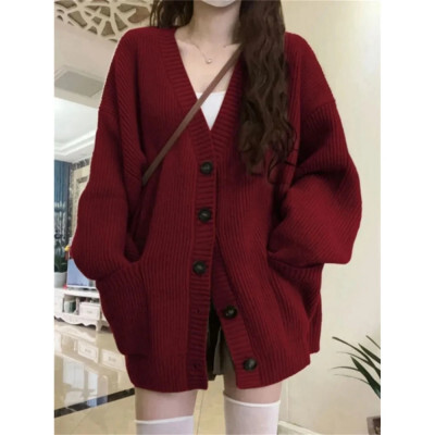 كسول نمط سترة منسوجة سترة الإناث عنابي الطلاب الخريف الشتاء فضفاض المتضخم السنة الجديدة العصرية معطف القمم هدية