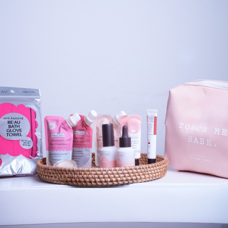 حقيبة أنيقة: تأتي المنتجات مع حقيبة “Frank Body” الوردية الأنيقة (Touch Me, Babe) لتنظيم أدواتكِ بأسلوب راقٍ.