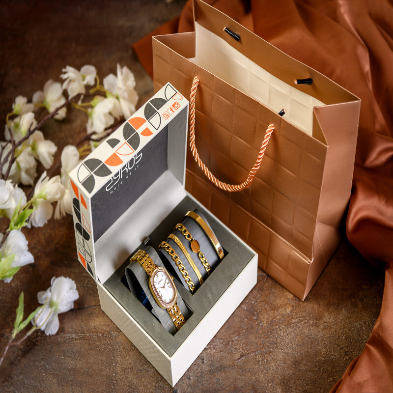 هذه الهدية النسائية الأنيقة المطلية بالذهب والمكتملة بساعة عصرية وأساور مميزة للحياة اليومية ستجعلها تشعر بالتميز.